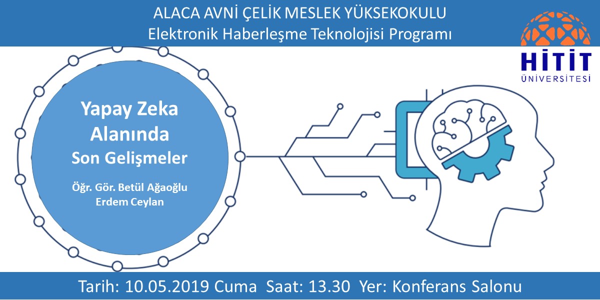 Meslek Yüksekokulumuz Eğitim Komisyonu tarafından organize edilen Eğitim Seminerlerinin ikincisi Elektronik Haberleşme Teknolojisi programı tarafından 10 Mayıs 2019 Cuma Saat 13.30 da Yüksekokulumuz konferans salonunda gerçekleştirilecektir. "Yapay Zeka Alanında Son Gelişmeler" başlıklı sunumu Öğr. Gör. Betül Ağaoğlu ve Elektronik Haberleşme programı 2. sınıf öğrencilerinden Erdem Ceylan sunacaklardır. Tüm personel ve öğrencilerimiz davetlidir.