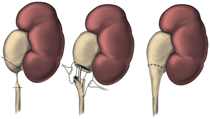 Gerekli tetkiklerin yapılması sonrası tanı konularak idrar akışını engelleyen dar yapı çıkarılır ya da çaprazlayan damardan üreter kurtarılarak sağlıklı olan dokular birleştirilir. Bu ameliyatlar çoğu merkezde açık, bazı ileri merkezlerde kapalı (laparaskopik veya robotik) yapılabilmektedir.